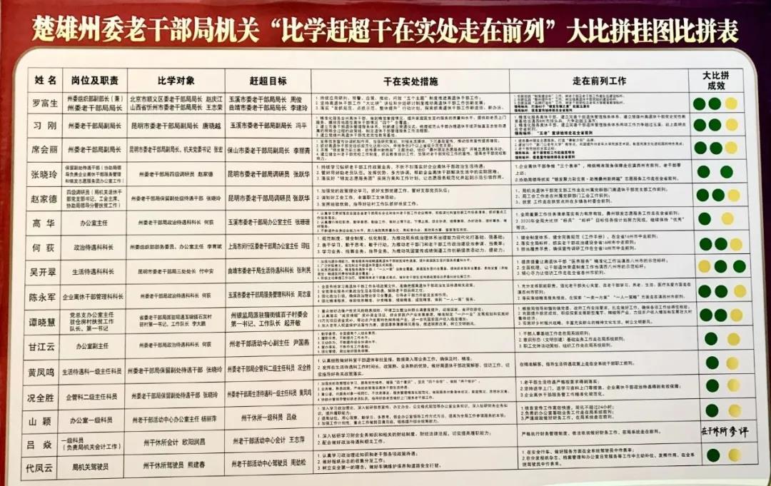 紧紧围绕深入学习贯彻习近平总书记考察云南重要讲话和关于老干部工作重要论述精神这个根本,结合州委“大比拼”工作部署和省委老干部局“比学赶超”活动要求,坚持自我加压、敢于突破,始终志不求易、力争一流,全局工作省级标兵标杆从2项增至4项,7个科室(直属单位)16项目标中省级以上目标占62.5%,2名干部在全国、其他处级和正科级干部均在全省选定学习追赶目标,并细化全州离退休干部工作“比学赶超干在实处走在前列”大比拼《挂图比拼表》和《挂图作战表》在办公区、活动阵地及网站、微信公众号公开公示,努力做到不达目标、绝不收兵。