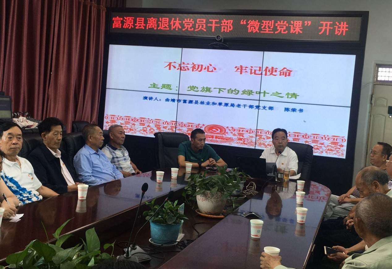 云南省富源县林业和草原局老干部党支部8月11日的党课,以“党旗下的绿色之情”为主题,由该党支部书记陈荣书主讲。陈荣书以该县老厂镇现年84岁,曾担任押得克村护林员的蒋守清老人几十年初心如一的护林事迹为题材,讲述了将守清从事护林工作40余年来,用实际行动诠释一代林业人践行“绿水青山就是金山银山”的故事。它不仅是一次党课,更是对全体听课人员的一次初心教育,老党员们都被他的讲授深深打动。同时,也拉开了云南省富源县离退休干部党员2020年第三季度“微党课”开讲活动的序幕。