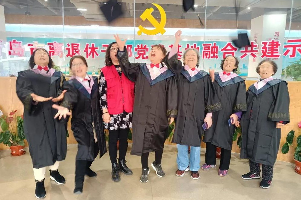 老年人学员身穿学士服,头戴学士帽,宛若即将告别校园,步入社会的莘莘学子,学员脸上都洋溢着快乐的笑容。
