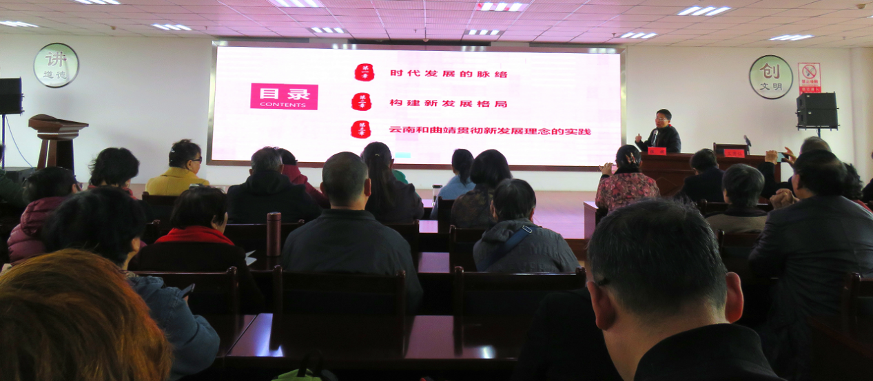 12月10日,云南曲靖市老年大学举办学习贯彻十九届五中全会精神专题讲座,特邀请了市委党校经济学教研室副主任、副教授张辉为现场90余名在校学员党员作专题解读,让精髓要义走进老年学员党员心中,让全会精神在老年大学落地生根。
