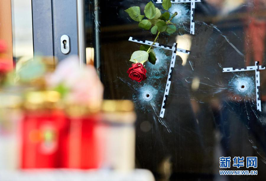 11月5日,奥地利维也纳的枪击事件现场放置着悼念遇难者的鲜花和蜡烛。2日晚发生的枪击事件造成多人伤亡。奥总理库尔茨谴责这起事件是“卑劣的恐怖袭击”。新华社发(乔治斯·施耐德摄)