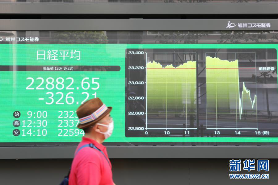 8月28日,日本东京街头的一处电子股指显示屏显示,下午14时左右,受时任日本首相安倍晋三或因健康原因辞职影响,股市指数急速下跌。新华社记者 杜潇逸 摄