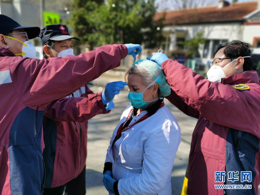 4月4日,中国赴塞尔维亚抗疫医疗专家组在贝尔格莱德的基层发热门诊走访时,帮助塞尔维亚医生特里富诺维奇(中)佩戴高标准的防护口罩。新华社发