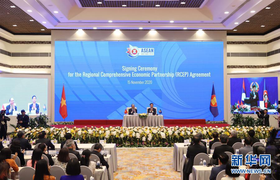 这是11月15日在越南首都河内拍摄的区域全面经济伙伴关系协定(RCEP)签署仪式现场。新华社/越通社