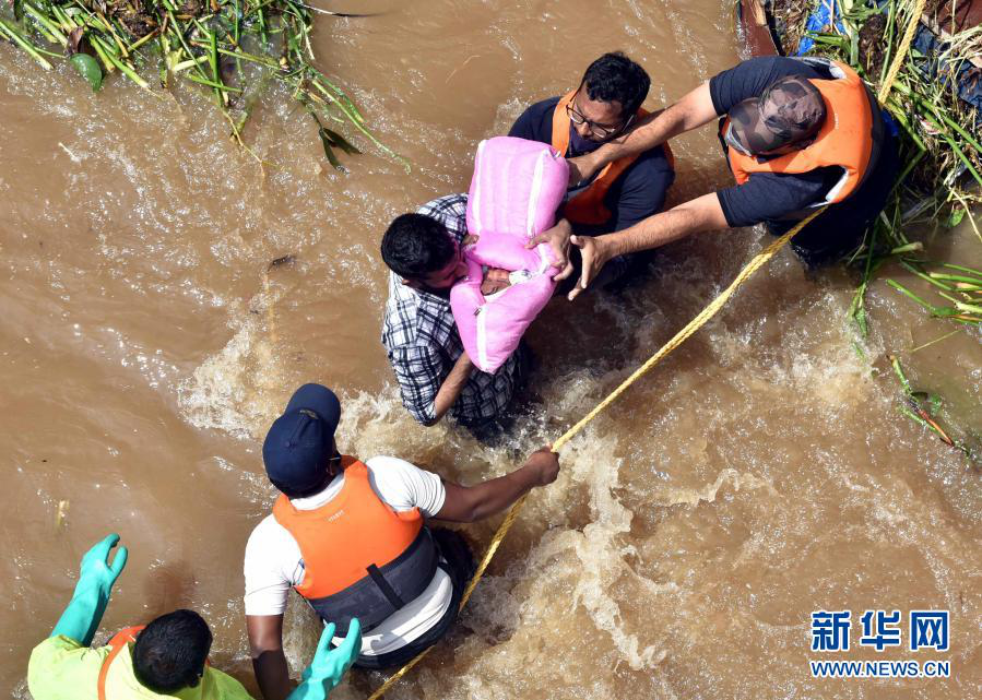10月18日,救援人员从印度海得拉巴一处被洪水围困的房屋中救出一名婴儿。新华社发