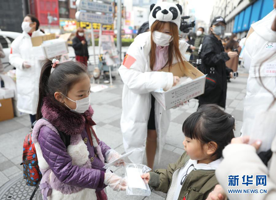 2月29日,在日本东京的池袋站前,在日华侨华人志愿者团体“口罩熊猫行动小组”向当地民众免费发放口罩,一名小志愿者(左)将儿童用口罩送给日本小朋友。新华社记者 杜潇逸 摄