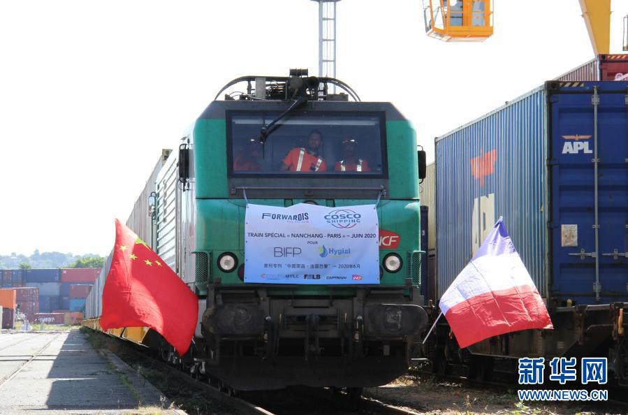 6月23日,满载防疫物资的中欧班列抵达法国巴黎东南郊的瓦朗通,此次班列是中法首趟抗疫物资专列。新华社记者 徐永春 摄