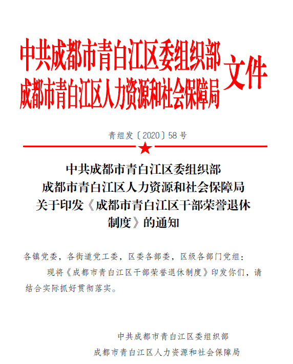 为进一步加强和规范干部退休相关工作,切实增强干部退休的荣誉感、归属感、使命感,引导广大干部离岗不离党、退休不褪色,继续为党和人民事业增添正能量。近日,四川成都市青白江区委组织部、区人社局联合印发《成都市青白江区干部荣誉退休制度》。