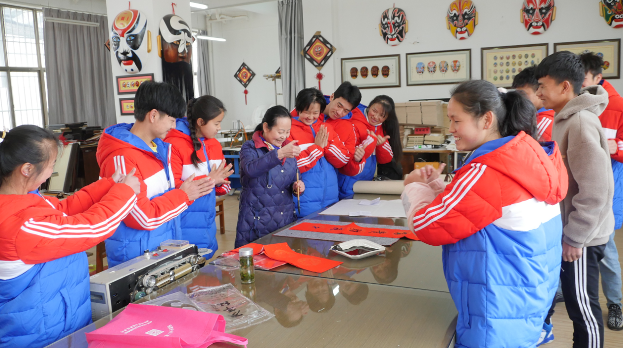 上午9点,市特殊教育学校张晓斌艺术脸谱工作室里墨香四溢、掌声阵阵。“内外平安好运来 阖家欢乐财源进”一幅幅喜庆、吉祥的春联从老师手中随笔而出,为师生们送上新春的祝福。“厚德载物”“学高为师”一句句箴言,表达出对特殊教育学校的老师们崇高的敬意,是他们用爱心、耐心、真心照亮孩子们的成长之路。“宁静致远”“精行俭德”一字字寄语,饱含着对孩子们勤加学习、自强不息的殷切希望。