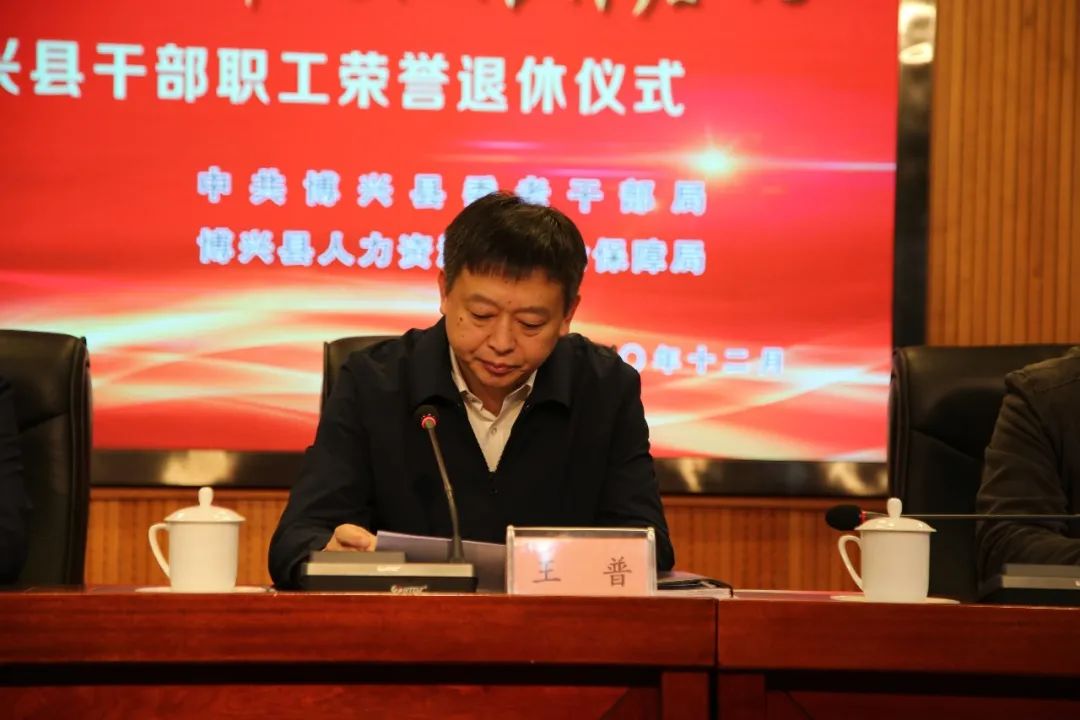 王普同志代表县委向新退休干部致以敬意和谢意,肯定大家几十年执着坚守和对博兴经济发展做出的贡献,祝福新退休干部尽快适应退休生活,找寻生活乐趣,同时诚挚希望退休干部一如既往关心支持博兴经济社会发展,宣传推介博兴,发挥优势,助力社会治理,持续凝聚释放正能量。