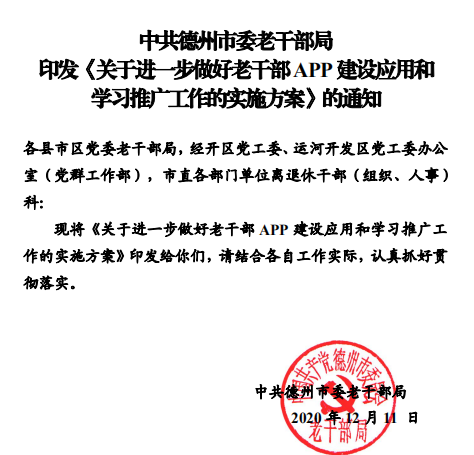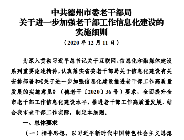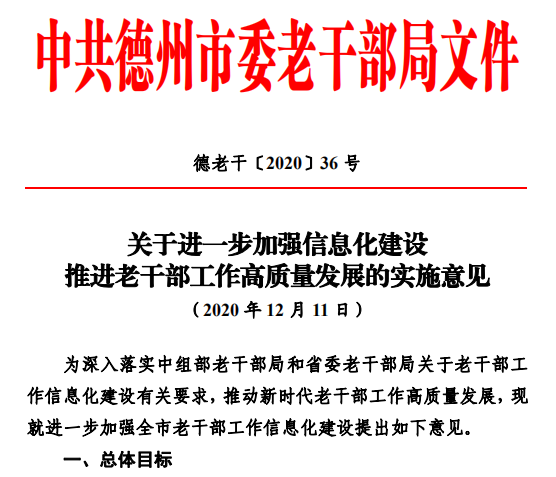 为建立健全老干部工作信息化建设制度机制,加强信息化建设工作规范,提升信息化建设系统性针对性有效性,近日,德州市坚持“总体设计、细化推进和重点突破”相结合,研究印发了以“三个一”(即“一个意见”《关于进一步加强信息化建设推进老干部工作高质量发展的实施意见》;“一个细则”《关于进一步加强老干部工作信息化建设的实施细则》和“一个方案”《关于进一步做好老干部APP建设应用和学习推广工作的实施方案》)为主体的信息化建设制度体系,从不同层面对信息化建设做出了制度安排、搭建了制度框架,以制度建设为抓手,掀开了老干部工作信息化建设新篇章。