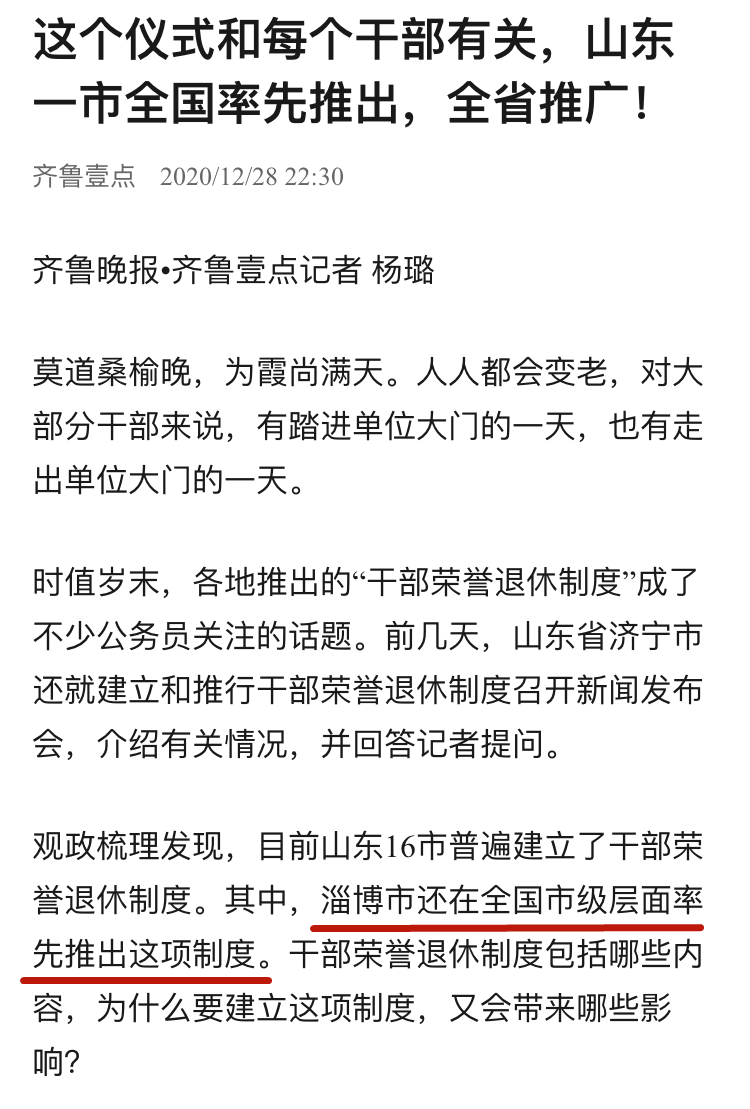 作为全国市级层面干部荣誉退休制度发源地,2020年,淄博市持续抓好制度落实,涵盖市、区(县)、镇(街道)、学校、医院等各级各行业的130余家单位为1200余名退休干部举办了荣退仪式,全国50余个部委、省、市学习咨询相关做法。