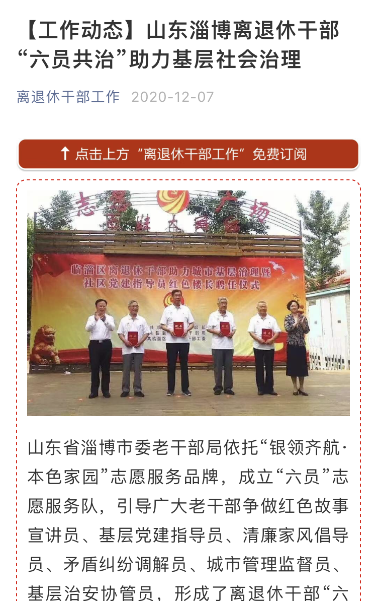 成立老干部“六员”志愿服务队:红色故事宣讲员、基层党建指导员、清廉家风倡导员、矛盾纠纷调解员、城市管理监督员、基层治安协管员。“六员共治”助力基层社会治理,为打造品质淄博、活力淄博、时尚淄博贡献桑榆力量。做法被中组部“离退休干部”微信公众号予以宣传推广。