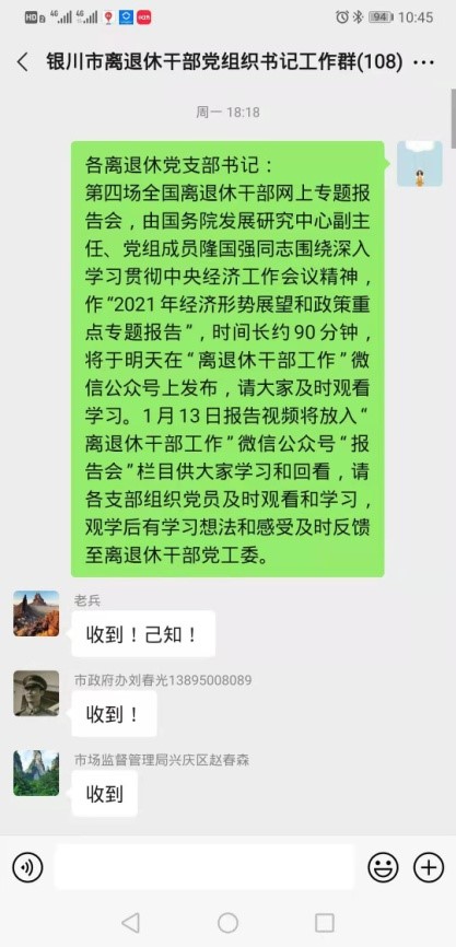 三是典型带动。通过收看专题报告会,切实把广大离退休干部和老干部工作者的思想和行动统一到中央经济工作会议精神上来,把智慧和力量凝聚到落实会议确定的各项目标任务上来,形成学习宣传贯彻会议精神的浓厚氛围。老同志纷纷点赞,表示将自觉争做中央经济工作会议精神的遵守者、维护者和宣传者。广大老同志通过微信交流群、“银川市老干部”公众号说感受、讲体会、谈收获。大家一致认为,通过网络收看报告会,这种学习方式很新颖,学习内容务实管用,而且可以随时随地看,没记住的可以反复看,学习效果很好,实现了疫情防控情况下既防止不必要的人员聚集,又使老同志学习不断档,体现了中组部老干部局和自治区党委老干部局对老同志思想政治的关心和生活上健康上的关爱。