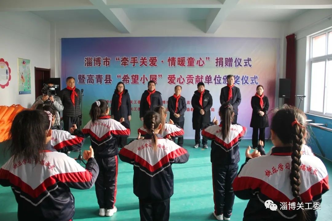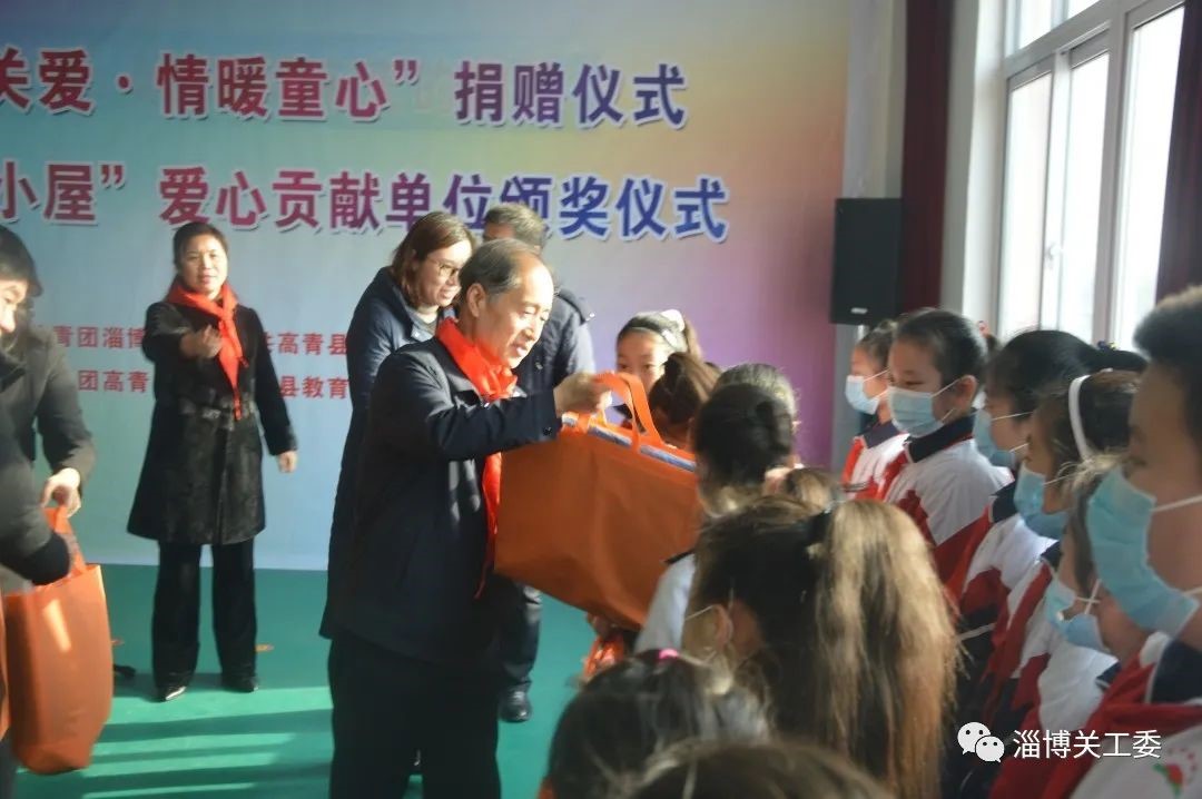 情暖童心”捐赠活动。市关工委常务主任陈家金、副主任王维华,淄博市委老干部局正县级干部、市关工委副秘书长徐文勇,团市委、高青县相关领导同志参加活动,为牵手关爱儿童发放爱心羽绒服。