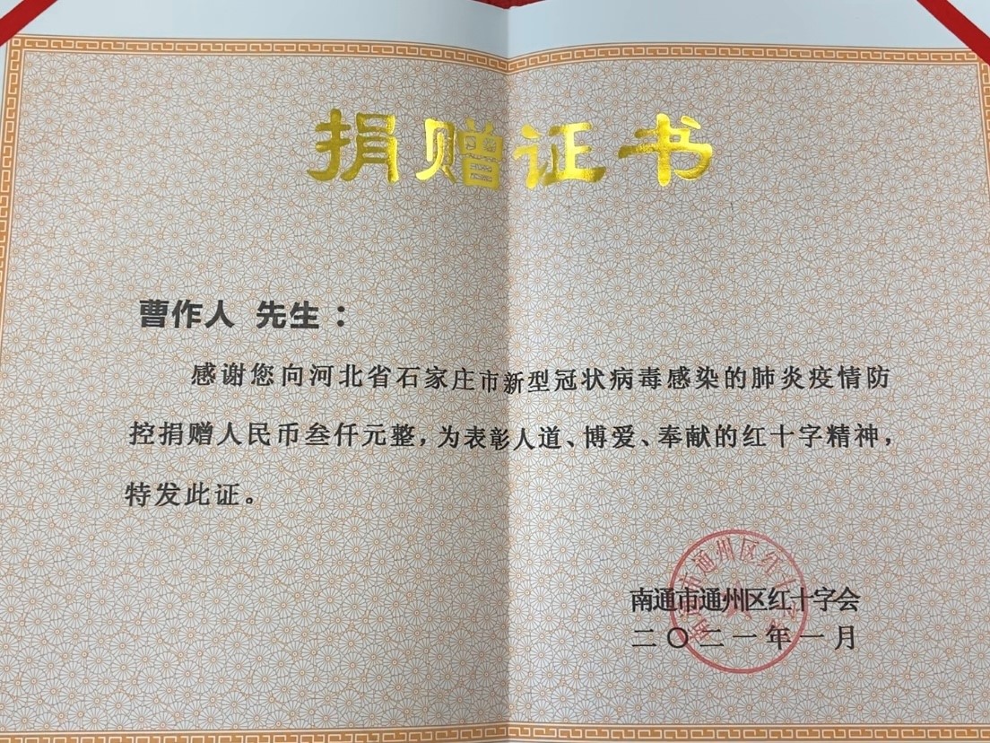 “我想尽一份绵薄之力,帮助石家庄人民渡过难关。”家住金西的曹作人曾是一名乡村卫生院的基层医生,1983年退休以来,从汶川地震、玉树地震到盐城龙卷风,他多次奉献爱心,成为红十字会的“老熟人”。“基本上只要有比较大的灾情发生,曹老都会来捐款,我接待了好多次了。”通州区红十字会秘书长王玉梅回忆说。新冠肺炎疫情爆发以来,曹老时刻关注疫情形势,去年就曾为抗疫工作捐献过一笔3000元的善款。