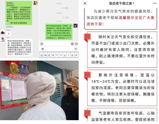 四是宣传引导到位。采取“线上+线下”的方式,及时发布寒潮预警,向老干部普及寒潮防护知识。通过微信公众号、微信群等平台发布严寒天气预警及天气降温提示,提醒老干部注意出行安全、加强疾病预防,做好用电用水用火用气安全防护措施,确保取暖安全。张贴极寒天气提醒公告,公布社区电话和各类应急电话,为老干部解决遇到的问题提供便利。