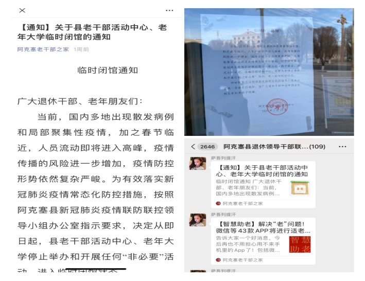 立即行动,及时关闭中心活动场馆。1月11日起,活动中心场所将暂时关闭,通过在中心门口张贴《临时闭馆通知》,利用“老干部之家”微信公众号、“阿克塞县退休领导干部”微信群、打电话等方式告知退休老同志,做好闭馆解释说明工作,争取老同志的理解支持。同时,号召老同志支持疫情防控工作,遵守疫情防控有关要求,做好个人防护,为坚决遏制疫情蔓延势头、打赢疫情防控阻击战贡献力量。