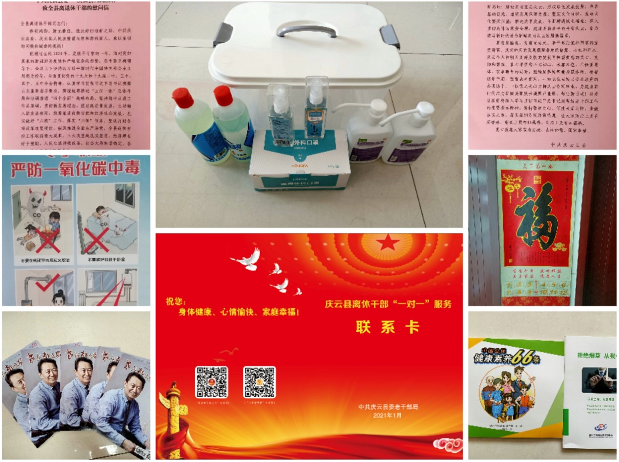 同时,为了让老同志在疫情防控的特殊时期,更好感受到党委政府的关心关怀,让老同志过一个健康、安全、文明、充实的春节,县委老干部局牵头对接县委办公室、县委政法委、县政府办公室、卫健局、疾控中心、应急管理局等7部门,面向全县离休干部和部分县级退休干部联合开展了以“送慰问、送爱心、送健康、送安全、送服务”为主要内容的“十个一”春节暖心行动,即:各服务单位明确一名班子成员专人负责;坚决落实一系列疫情防控措施;为老同志送上一封县委县政府慰问信;一份春节慰问品;一箱疫情防护用品;一期《老干部之家》杂志;一套《健康素养66条》《控烟禁烟科普手册》;一卷“崇尚科学、反对邪教”新年年历;一幅冬季安全取暖宣传挂图;一张离休干部“一对一”联系服务卡,在简化走访形式的同时,通过务实暖心的举措,为老同志送上新春祝福,向老同志致以崇高敬意,向长期以来老同志对全县发展的关注支持表示感谢,努力让老同志在疫情防控的寒冬有更多幸福感获得感安全感。