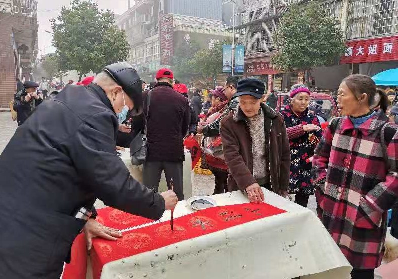 活动设置在仙临场镇街道旁,为广大村民们展出了刘家镇大庙村脱贫攻坚的照片,以及会员们创作的绘画、毛笔书法等作品。正值赶场之日,村民们纷至沓来,感受浓浓的文化氛围。近3小时的活动时间里,志愿者们为村民赠送了提前写好的春联100副、“福”字100张;书画组成员则现场为乡亲们写送春联100余副、“福”字100余张。活动现场喜庆热烈,乡亲们喜笑颜开。会长郭理坝不禁赋诗一首《送文化下乡》:“乘风破雾白云边,老骥仙临喜讯传。执笔挥毫文化送,城乡一体庆丰年”。会员邓彬也感赋一首:“雨霾岁末识风寒,老干仙临写对联。志愿宣传存大爱,红红火火迎牛年。”