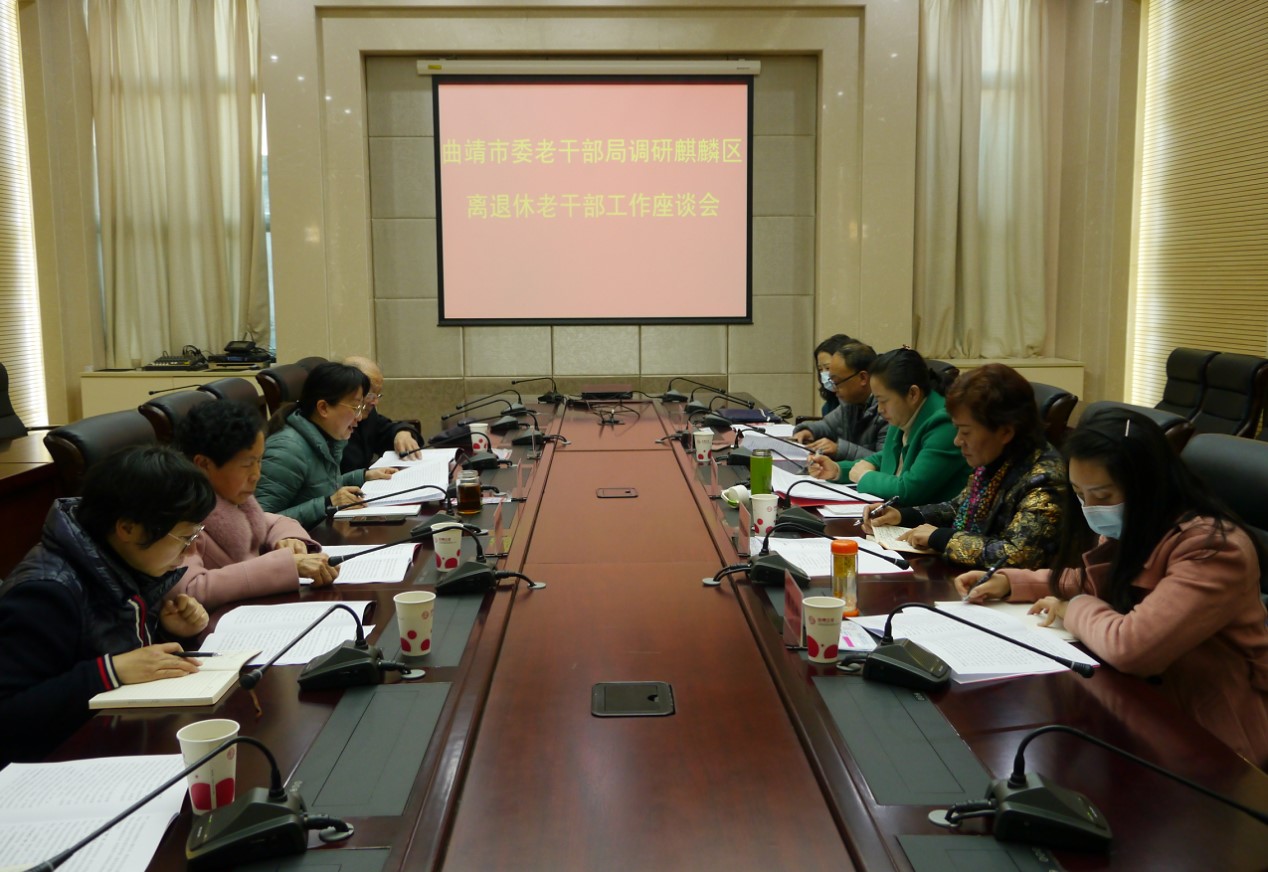 调研组一行先后听取了麒麟区离退休干部工作情况汇报,召开了离退休干部代表、区委老干部局工作人员座谈会,查阅了相关台账资料,实地察看了潇湘街道老年大学教学点、越州镇老年大学送教下乡示范点,并走访慰问了唐君平、魏华国等离休干部。