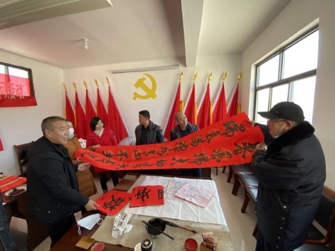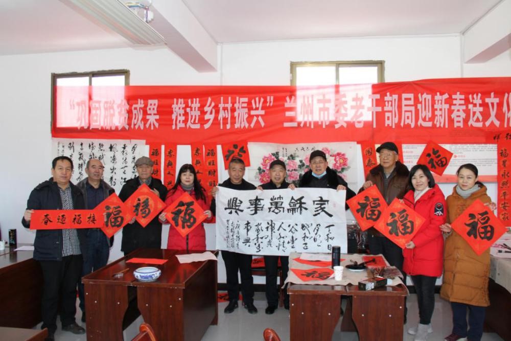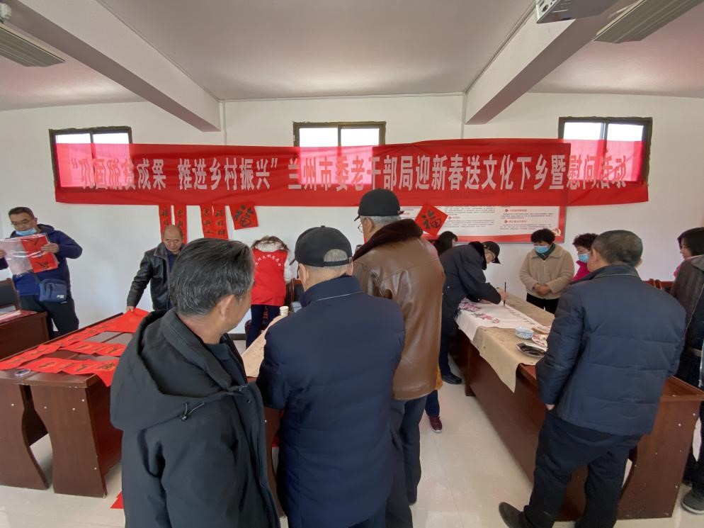 为进一步巩固脱贫攻坚新成效,推进乡村振兴战略实施,发挥广大离退休干部作用,营造节日浓厚氛围,2021年2月2日,由兰州市委老干部局主办,甘肃兰州市老干部活动中心、兰州老年大学协办的“‘巩固脱贫成果、推进乡村振兴’——2021年春节送文化下乡活动”,在榆中县和平镇范家营村隆重举行,10余名离退休干部书画家现场书写春联,为群众送上新春的祝福。