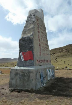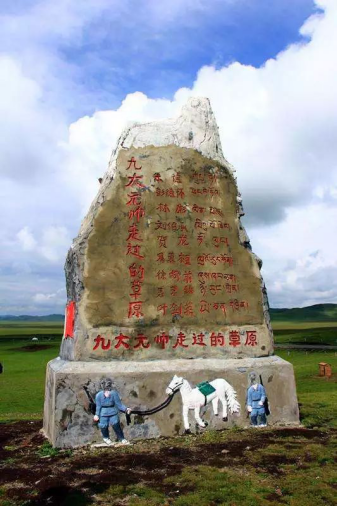 我们首先瞻仰位于省道209线旁边的“九大元帅过草原纪念碑”。碑的正面用汉藏两种文字书写着“九大元帅走过的草原”,背面刻着九位元帅的名字。基座上刻着红军战士持枪牵马的浮雕。虽然简洁,但其所表现的历史意义非同一般。1935年6月至1936年8月,朱德、彭德怀等1955年授衔的开国十大元帅,除陈毅留在南方打游击,没有参加二万五千里长征外,其他九大元帅,都是从这里走过草地。在这里进行了艰苦卓绝的斗争,向世人展现了中国共产党人百折不挠、愈挫愈勇、不怕牺牲的精神。