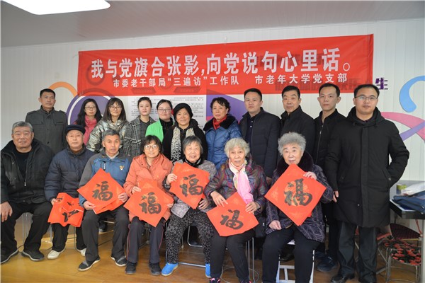 朴实的话语道出了古稀之年老党员们的初心,深情表达了他们对党的热爱、对党永葆青春活力的美好祝愿,表达了他们永远感党恩、听党话、跟党走的信心和决心。随后,市委老干部局“三遍访”工作队与市老年大学党支部为老党员们送上油、米等慰问品和市老年大学校报《晚晴苑》《晚晴文集》等学习资料,并向化机小区的居民入户送去“福”字和春联。