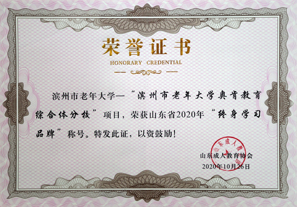 六、“滨州市老年大学奥肯教育综合体分校”项目荣获2020年山东省“终身学习品牌项目”。