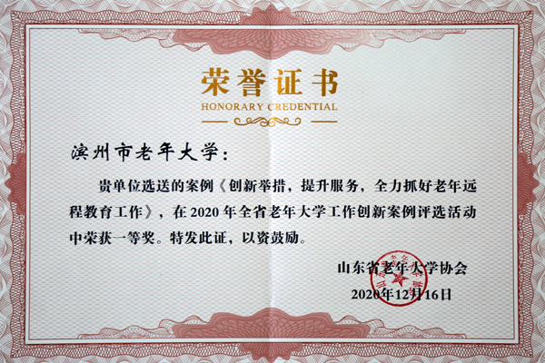 七、滨州市老年大学提报的工作创新案例《创新举措,提升服务,全力抓好老年远程教育工作》,在2020年全省老年大学工作创新案例评选中荣获全省一等奖。