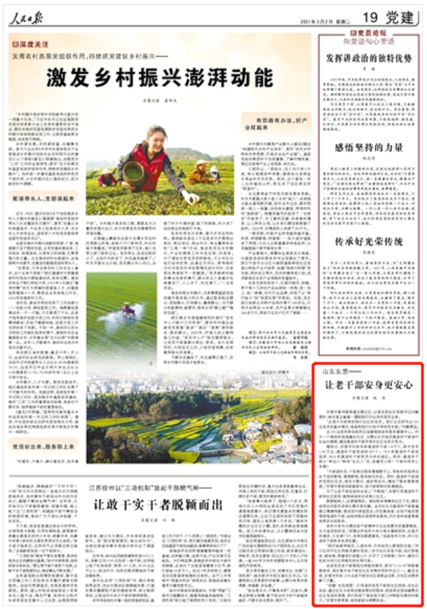 3月2日,《人民日报》第19版刊发了《山东东营——让老干部安身更安心》一文,对东营市创建“本色家园”,推动老干部工作进社区典型经验做法进行了报道。
