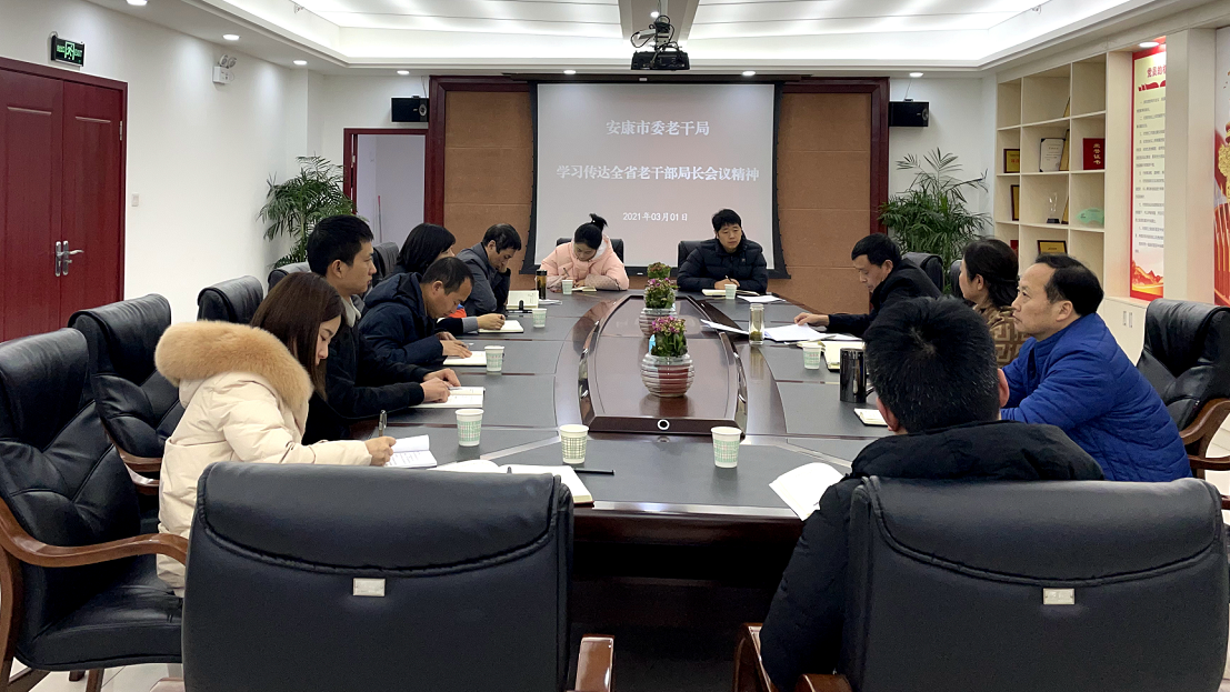 3月1日,陕西安康市委老干局召开全体干部大会,专题传达学习全省老干部局长会议精神,研究贯彻落实意见,安排部署2021年老干部工作重点任务。市委组织部副部长、市委老干局局长陈稳主持会议,局属各单位负责同志参会。