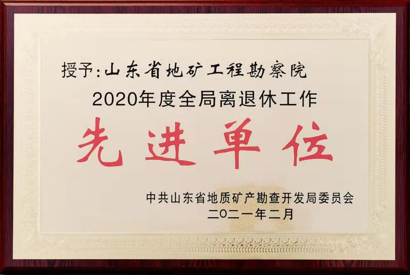 近日,山东省地矿工程勘察院荣获山东省地矿局“2020年度全局离退休工作先进单位”称号,张水英、鞠富荣、姚忠等同志荣获“2020年度全局优秀离退休职工”称号,林敬龙同志荣获“2020年度全局优秀离退休工作者”称号。
