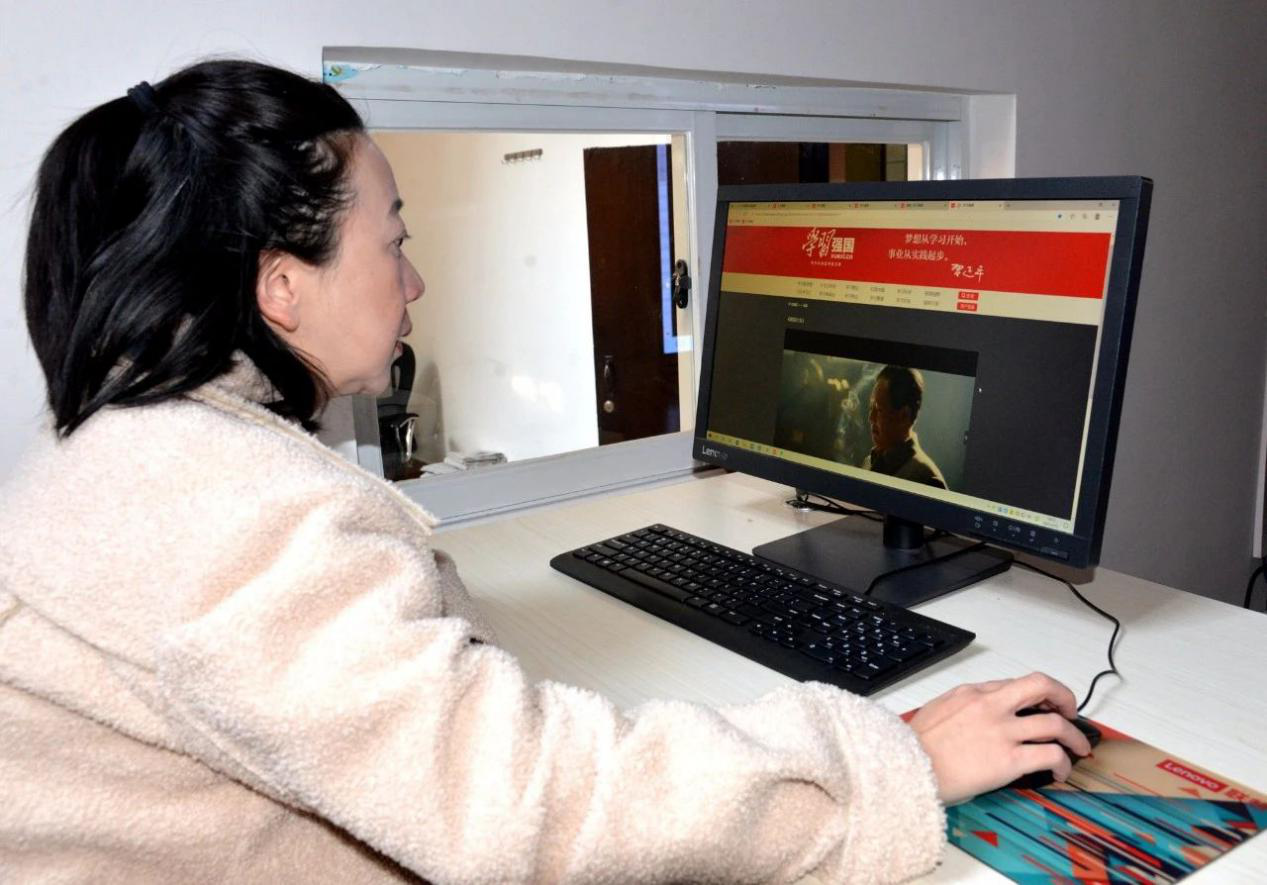 工作人员利用“学习强国”平台打开电影《建国大业》