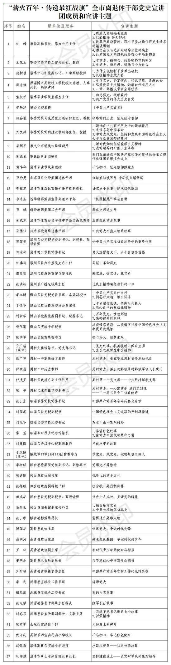 为充分发挥离退休干部熟悉党史的独特优势,助推全市党史学习教育,淄博市委老干部局联合市委组织部、市委宣传部等8部门组建了“薪火百年·传递最红战旗”淄博市离退休干部党史宣讲团,为各区县、各部门(单位)党史教育理论学习和主题党日等提供菜单式志愿宣讲服务,现就宣讲团成员和宣讲主题进行公布(附后)。