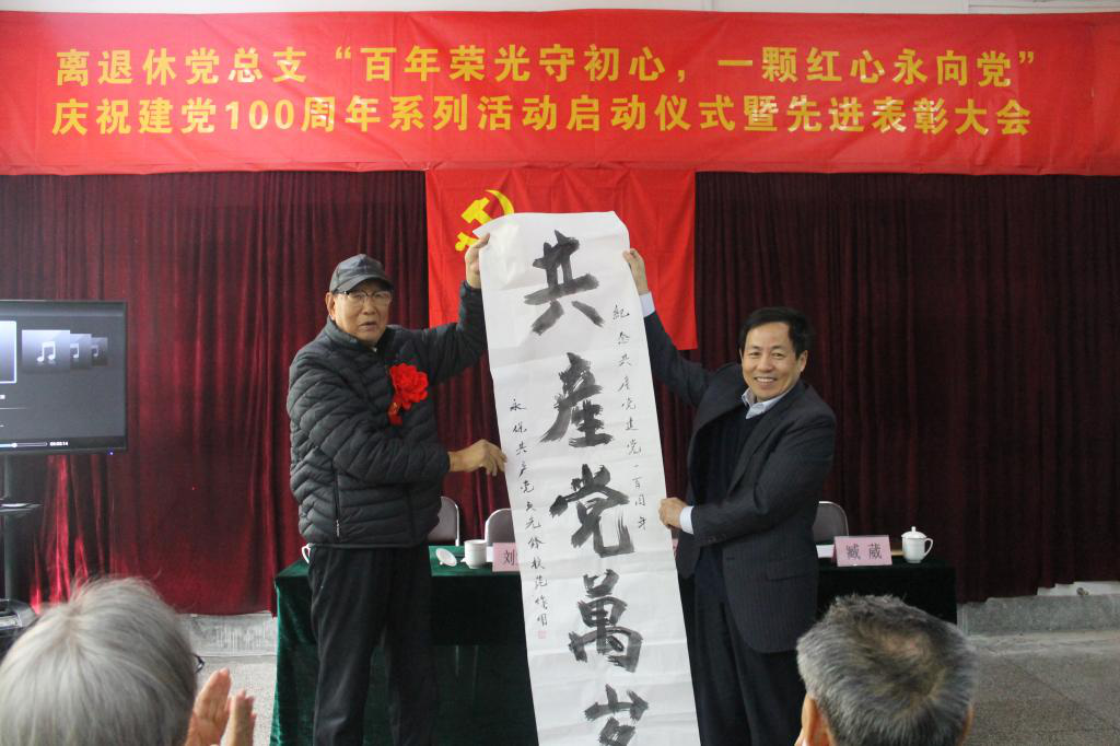 离休干部、原学校副院长、92岁高龄的徐进同志,专门为纪念建党100周年挥毫泼墨,书写了“共产党万岁---永葆共产党员先锋模范作用”,并进行了赠送仪式。