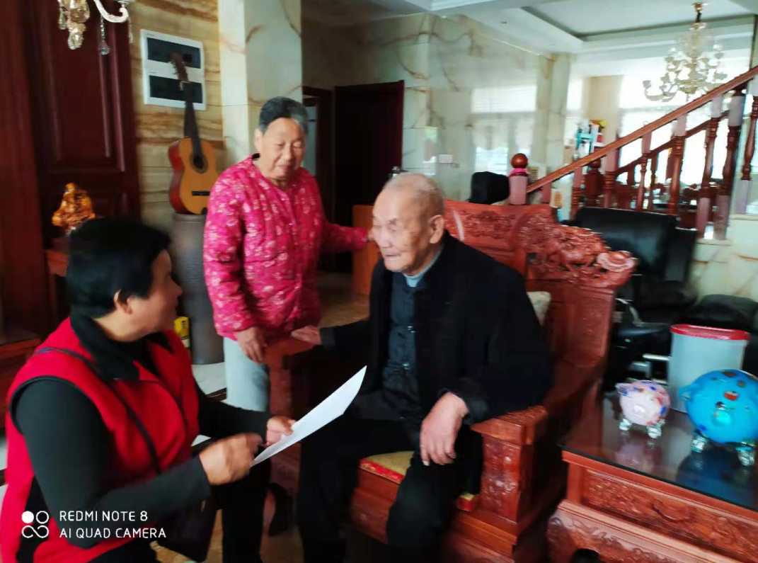 在峨山县汽车客运站职工宿舍楼,服务队在94岁高龄的离休干部矣芳家中,送温暖上门,抚慰他安享幸福、健康长寿。