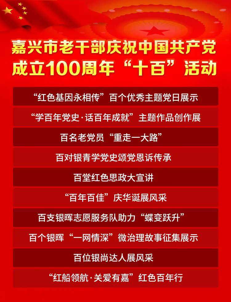 嘉兴以“百年逐梦•银耀嘉禾”为主题,突出红船味和时代性,动员引导3.8万多名离退休干部参与庆祝中国共产党成立100周年“十百”活动,彰显中国革命红船启航地党建工作特色,组织开展“红色基因永相传”百个优秀主题党日展示、“学百年党史•话百年成就”主题作品创作展、百名老党员“重走一大路”、百堂红色思政大宣讲、“红船领航•关爱有嘉”红色百年行等“十百”活动,以形式多样的主题活动学好讲好党史,传承红色基因,赓续红色血脉,展示百年大党的风华正茂、建党百年所取得的伟大成就,让老同志、在职干部和青少年学党史、受教育、启新程,为嘉兴打造“重要窗口”中最精彩板块蓄能聚力。