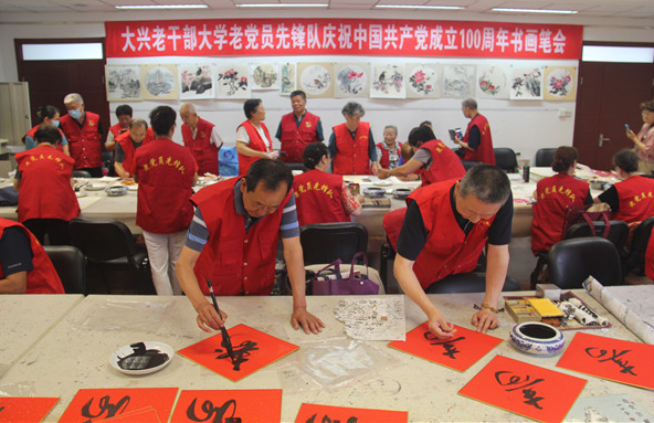 6月29日,大兴老干部大学老党员先锋队举办庆祝中国共产党成立100周年书画笔会,40余名队员参加活动。活动现场,围绕建党百年主题,老党员们挥毫泼墨,各展所长,以笔墨倾情,以书画言志,创作出一幅幅精美的书画作品,重温党的光辉历程,礼赞中国共产党建党百年的丰功伟绩。件件作品或气势磅礴或栩栩如生,表达了老党员们对党、对祖国的真挚情感和永远跟党走,奋进新时代,实现中华民族伟大复兴中国梦的坚定信念。