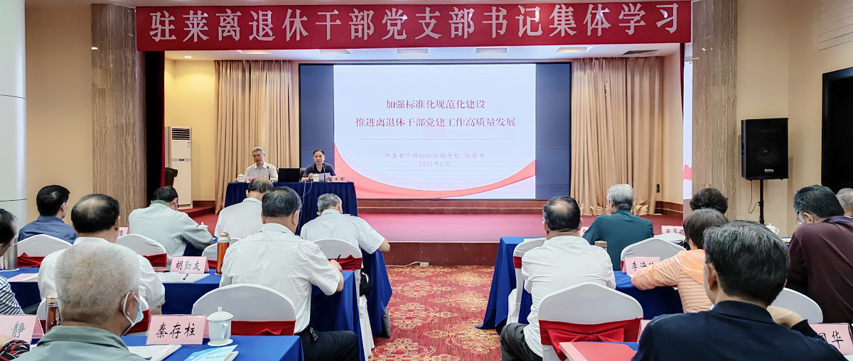 引导老有所学,全面感悟初心使命。精心筹划开展“学党史、守初心”系列活动,组织召开驻莱离退休干部党支部书记培训班,强化驻莱老干部思想政治建设,确保老干部“离岗不离党、退休不褪色”;组织驻莱离退休干部观看庆祝中国共产党成立100 周年大会直播,参加学习贯彻习近平总书记“七一”重要讲话精神系列专题讲座,老同志们深入交流学习体会,表达了在党无上光荣、对党无比热爱、为党无限忠诚的深厚感情;开展“向党说说心里话”专题活动,老同志们通过诗词、寄语、保证书等形式踊跃参与、向党告白,推动驻莱离退休干部党的建设规范有序开展,老同志组织力、向心力显著增强。