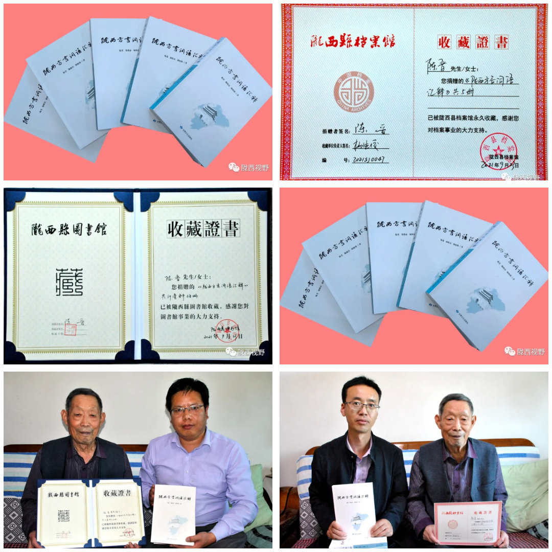 9月23日,85岁高龄,原甘肃定西市陇西师范调研员陈晋同志向县档案馆和县图书馆各捐赠自己编撰的著作《陇西方言词语汇释》5册。