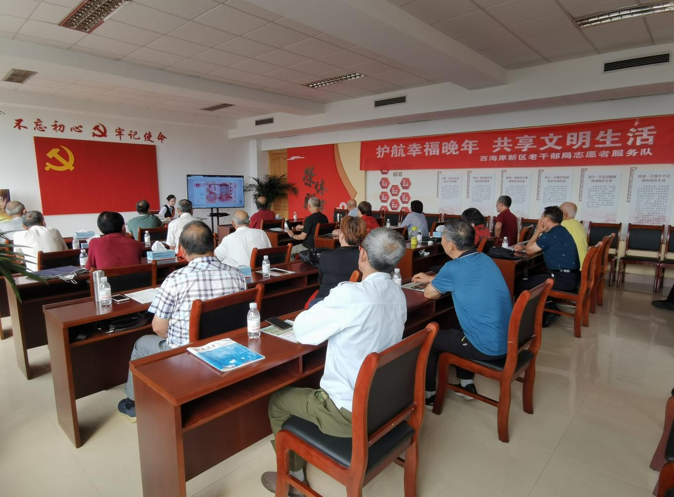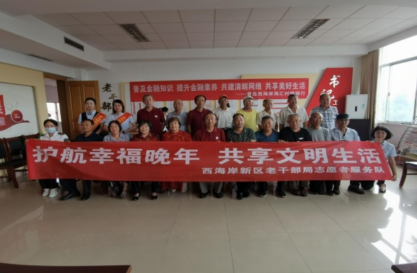 为积极参与新区全国文明典范城市创建工作,2021年9月24日上午,青岛西海岸新区工委老干部局与隐珠街道东风路社区联合青岛西海岸海汇村镇银行在新区老年大学联合开展“护航幸福晚年、共享文明生活”金融知识宣传活动。新区工委老干部局、人民银行黄岛支行有关领导,青岛西海岸海汇村镇银行党员代表,新区老干部志愿者,新区老年大学和东风路社区老年人代表共30余人参加活动。