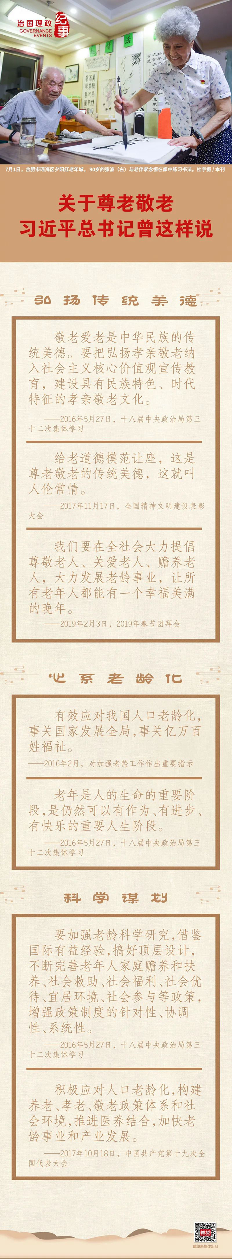 “古人讲,‘夫孝,德之本也’。自古以来,中国人就提倡孝老爱亲,倡导老吾老以及人之老、幼吾幼以及人之幼。我国已经进入老龄化社会。让老年人老有所养、老有所依、老有所乐、老有所安,关系社会和谐稳定。”2019年春节团拜会上,习近平总书记这样讲述他心中的“孝”与尊老敬老传统美德。