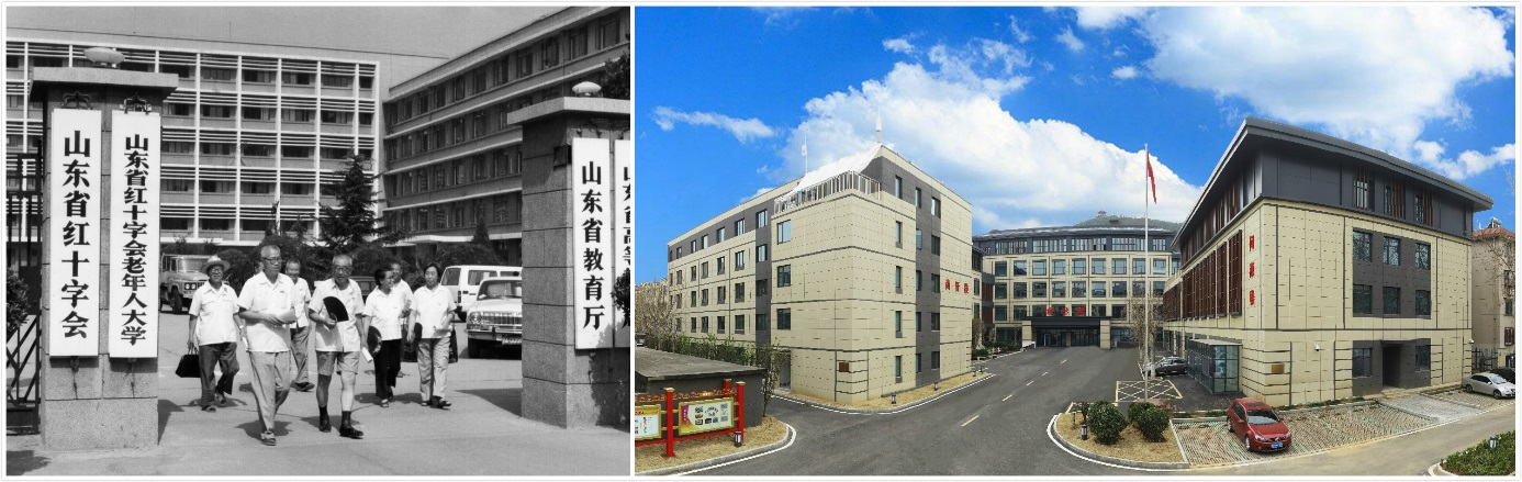 (左:山东老年大学建校初期照片 右:2021年建成启用新校区)