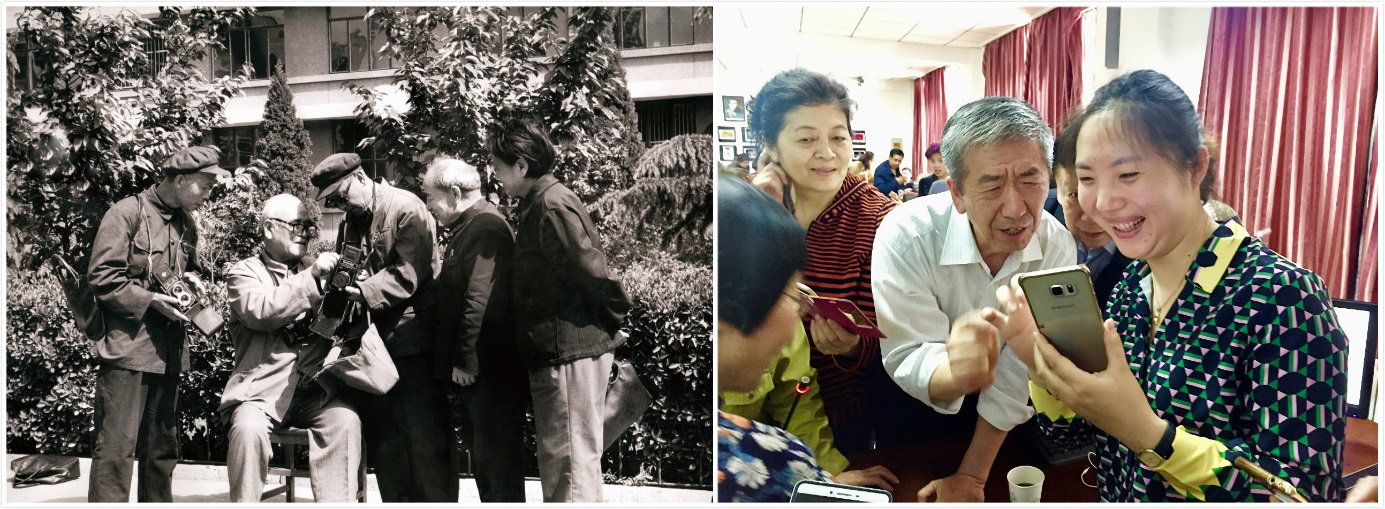 (左:1985年在文教大院校区的摄影课 右:智能手机班上课场景)