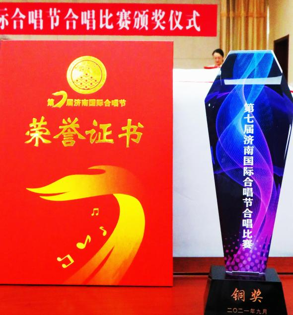 近日由济南市委宣传部等单位主办、由市文联等单位承办的第七届济南国际合唱节合唱比赛颁奖仪式在济南龙环大厦举行。根据疫情防控要求,本次颁奖仪式只邀请了十几个获奖团队参加。和谐之声合唱团在被邀请之列,代表获奖单位参加了颁奖仪式,并领取了获奖证书和奖杯。