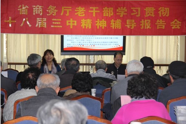 日前,省商务厅驻青老干部举办学习贯彻十八届三中全会精神辅导报告会,报告会邀请了青岛市委宣讲团成员、青岛市委党校马克思主义教研部副主任、副教授吕飞云作的题为《全面深化改革的行动纲领——三中全会精神解读》的专题辅导。