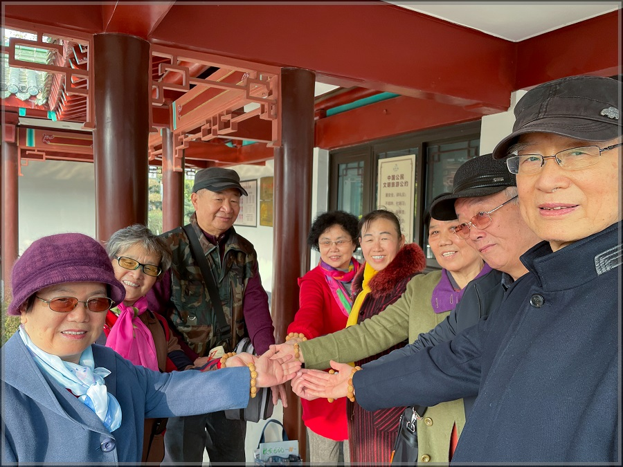 下午,“家”人博友们还共赴趵突泉公园赏菊看展。老“家”人张国贤、唐爱春、王学军等几位老师也特地从家里赶来与博友相聚。王学军老师还特地给大家带来了小礼物——亲手制作的桃核手链。那一粒一粒圆滚滚滑溜溜的小桃核都是他跑到公园里捡拾回来后,剥皮抠核打磨制作的,每一粒都包含着他对“家”人博友们的深厚感情。“家”人们表示,将一如既往坚守在“家”的平台和阵地,在文化养老的路上,玩在一起、乐在一起,并相约明年再聚!