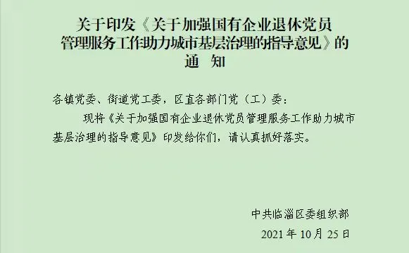 为深入贯彻全市城市基层党建工作会议精神,扎实推进国有企业退休人员社会化管理工作,助推“红色领航”工程落地落实,近期,淄博临淄区委组织部、区委老干部局、区财政局联合出台《关于加强国有企业退休党员管理服务工作助力城市基层治理的指导意见》(以下简称 《意见》),组织引导国有企业退休党员主动亮明身份、融入基层、发挥作用,为提升城市基层治理效能、加快建设富强文明智慧美丽的社会主义现代化新临淄注入新动能、增添正能量。
