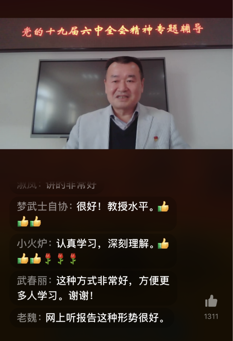 为切实做好党的十九届六中全会精神学习宣传工作,推动全会精神在广大离退休干部中的贯彻落实,近日,延庆区委老干部局举办“党的十九届六中全会精神”线上辅导报告会,200余名老干部观看直播,积极参与线上学习,点赞千余次。